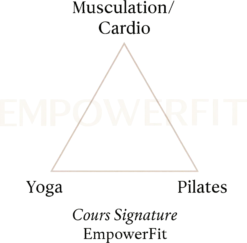 Combinaison unique de Yoga, Pilates, Musculation et coaching mental pour renforcer le corps et la confiance en soi.
